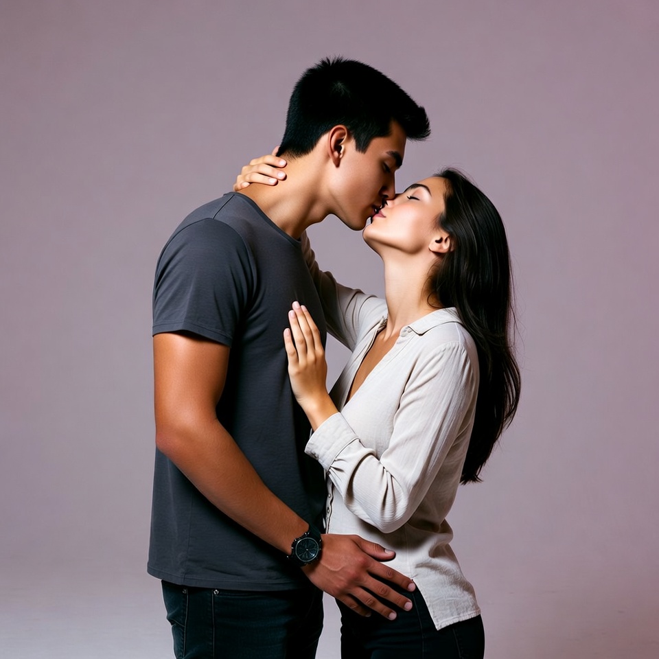 Asian man, Asian woman, black hair, couple kissing, embrace, female, gray t-shirt, intimate kiss, jeans, long hair, male, man kissing woman, neck kiss, pants, purple background, romantic couple, short hair, white blouse, young man, young woman, Asian couple