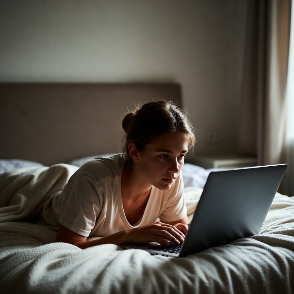 A young woman with brown hair in a bun lies in bed at night, typing on a laptop. She wears a light beige t-shirt and is covered with white blankets. The bedroom has soft lighting from a window with curtains.