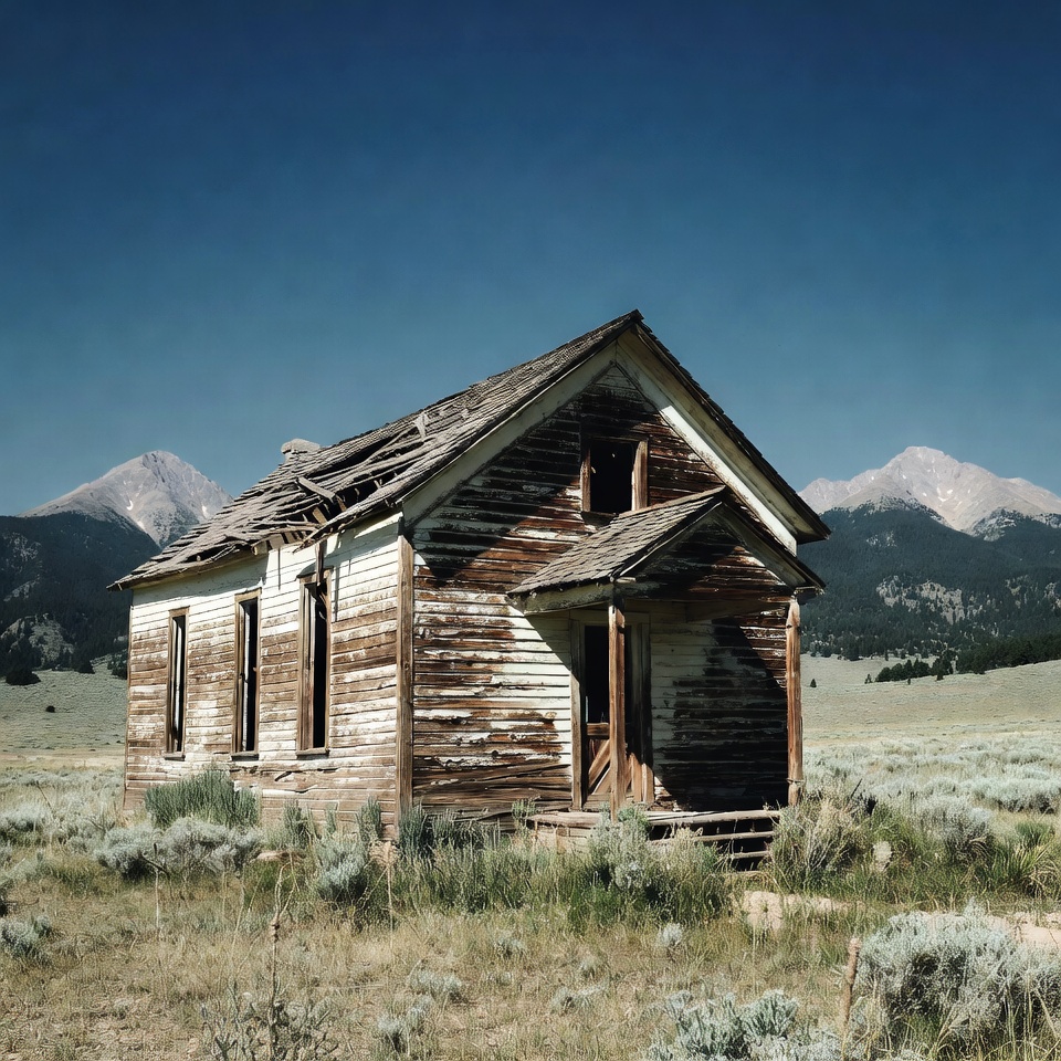 blue sky, boarded windows, decay, dilapidated structure, front door, grassy field, isolated house, mountain background, mountain view, old building, overgrown weeds, peeling paint, prairie field, rural landscape, sagging roof, snowy mountains, vintage building, weathered wood, wooden house, abandoned house