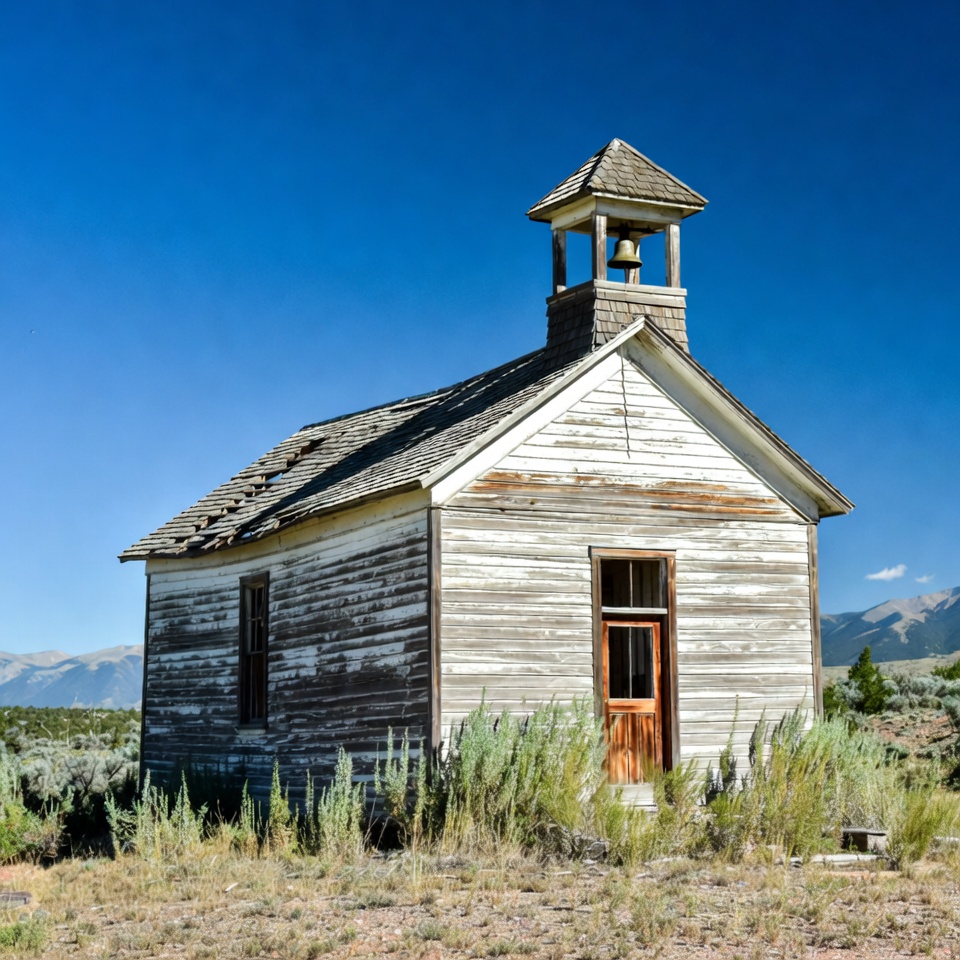 architecture, bell tower, blue sky, church bell, country church, desert landscape, dry grass, historic building, isolated church, mountains, old church, outdoor scene, rural landscape, small church, steeple, vintage church, weathered wood, white church, wooden church, abandoned church