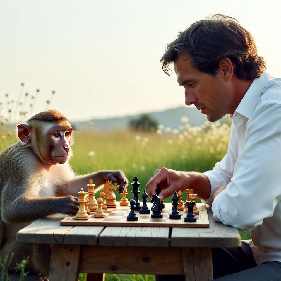 A man with short dark hair and wearing a white shirt sits at a wooden table in a grassy field, intently playing chess. A monkey with a light-colored face sits opposite him, gripping a chess piece with its hand. The chessboard features black and white pieces, set against a background of green fields and distant hills at sunset.