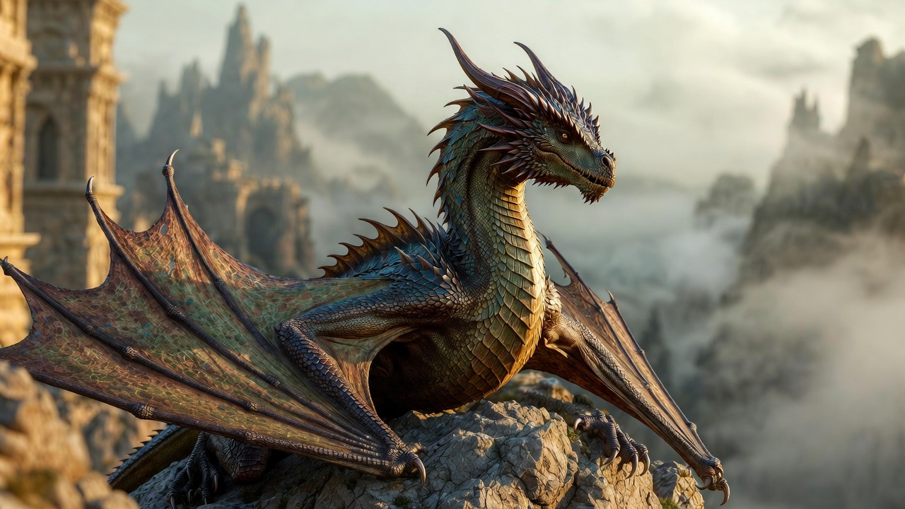 CGI dragon, ancient towers, castle ruins, claws, digital art, epic fantasy, fantasy creature, fantasy dragon, horns, majestic dragon, misty background, mountain landscape, mountains, perched dragon, realistic dragon, rocky cliff, scales, winged dragon, wings, dragon