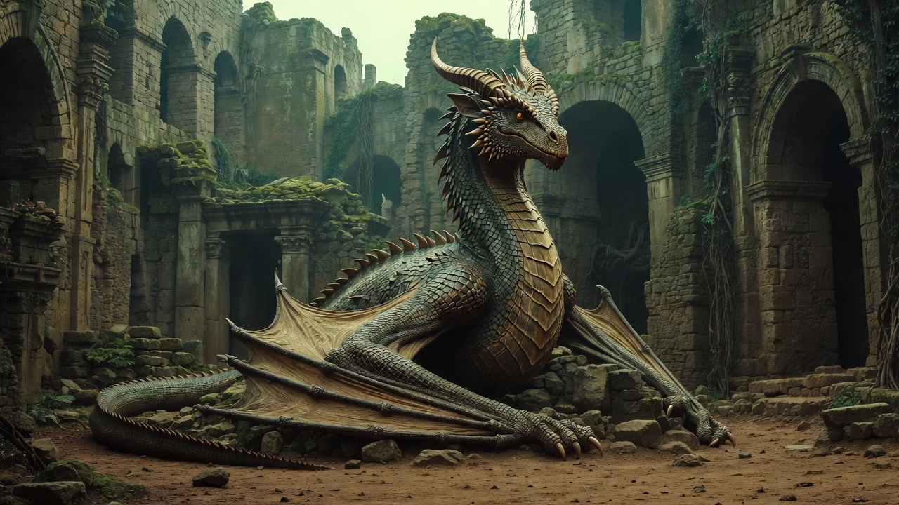 ancient ruins, arched doorways, castle ruins, claws, detailed scales, fantasy creature, fantasy dragon, gold scales, green dragon, horns, ivy, majestic dragon, mossy walls, mythical beast, overgrown, realistic dragon, sitting dragon, stone ruins, wings, dragon