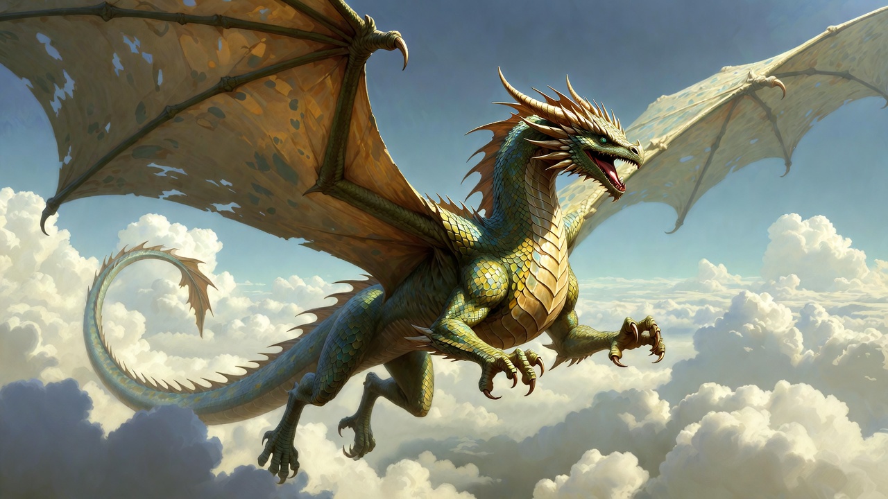 A majestic green dragon with golden accents soars through a sky filled with fluffy white clouds. Its large wings are spread wide, showcasing intricate scales and sharp claws. The detailed illustration captures the dragon in a dynamic flying pose against a bright cloudy background.