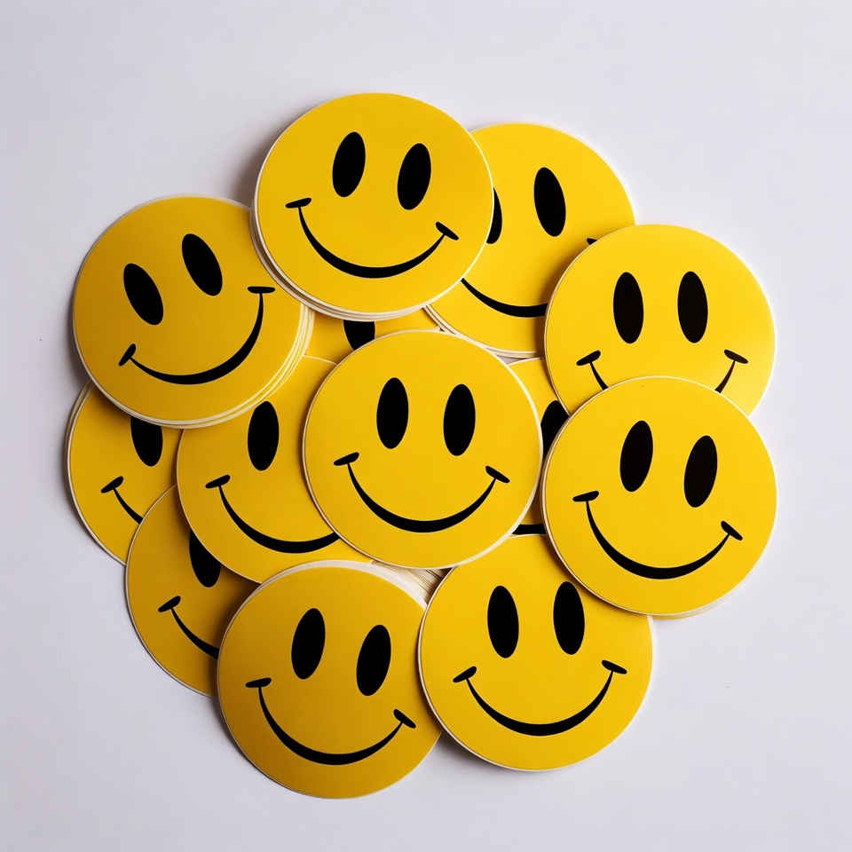 A cluster of yellow round stickers with black smiling faces is arranged in a pile on a white background. Each sticker features a simple happy face with curved mouth and round eyes. The stickers overlap slightly, creating a compact circular formation.