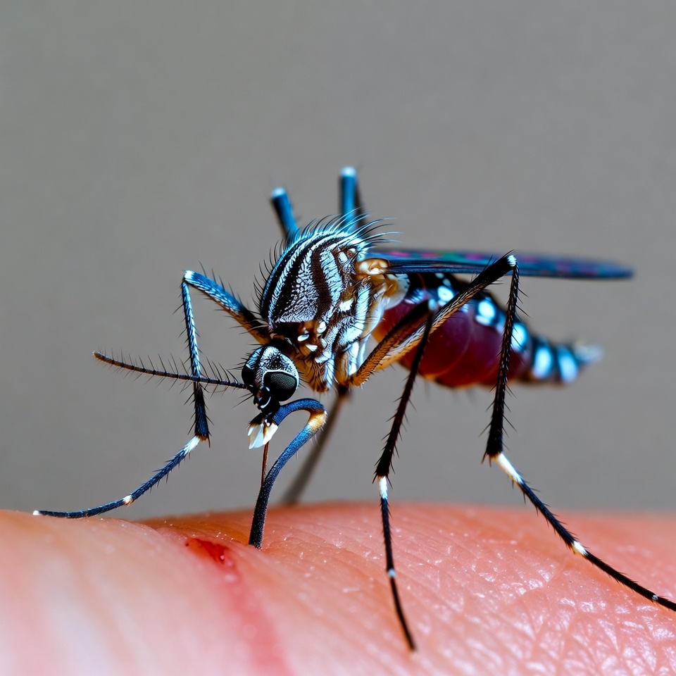 biting, black body, bloodsucker, blue wings, bug, close-up, human finger, insect, iridescent, isolated background, legs, macro, proboscis, skin, striped abdomen, wings, mosquito