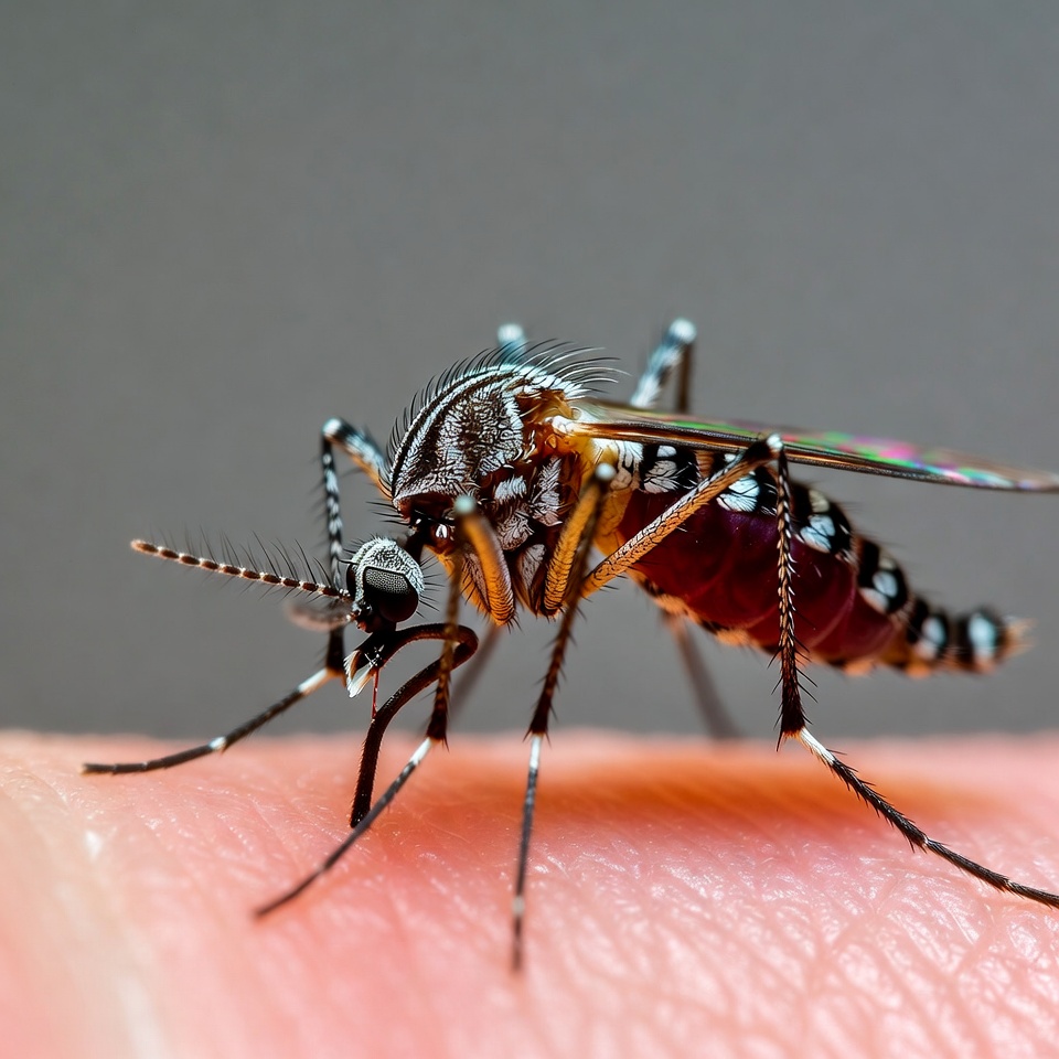 arthropod, biting insect, bug, close-up, finger, human finger, insect, isolated background, legs, macro, proboscis, striped body, wildlife, wings, mosquito