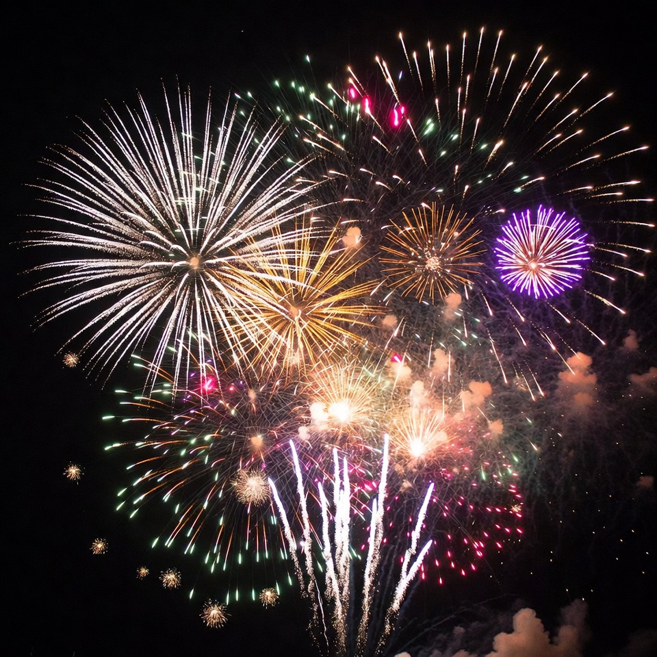 aerial bursts, bright lights, celebration lights, colorful fireworks, dark background, exploding fireworks, festive fireworks, gold fireworks, green fireworks, multi-colored bursts, night display, night sky, orange fireworks, purple fireworks, pyrotechnics, red fireworks, sky explosions, spark trails, white fireworks, fireworks