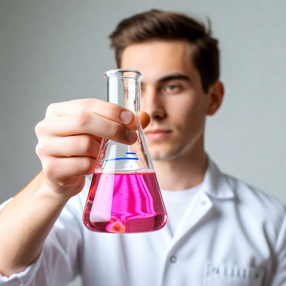 A young man with short brown hair and green eyes holds a glass beaker filled with bright pink liquid. He wears a white lab coat and stands against a plain gray background. His expression is neutral as he displays the beaker in his hand.