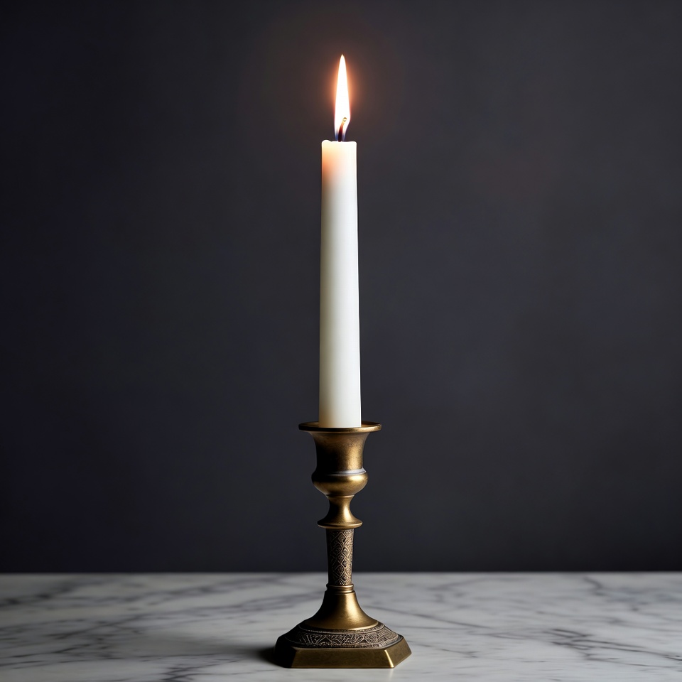 A tall white candle with a bright flame sits in an ornate brass candlestick. The candle is centered on a marble surface against a dark background. The flame glows vividly, casting subtle light.