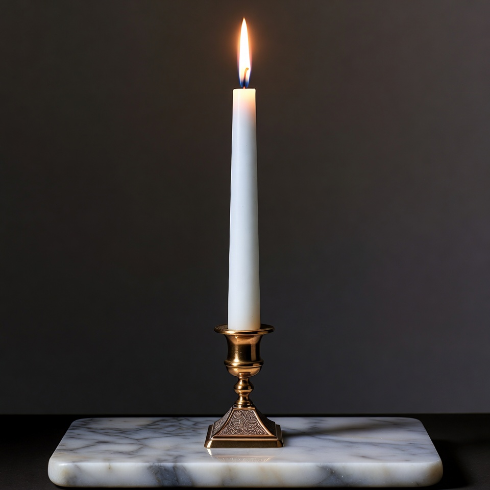 burning candle, candle flame, candle holder, candlestick, decorative candle, elegant candle, fire, flame, gold candlestick, isolated background, lit candle, marble surface, single candle, taper candle, warm light, wax candle, white candle, candle