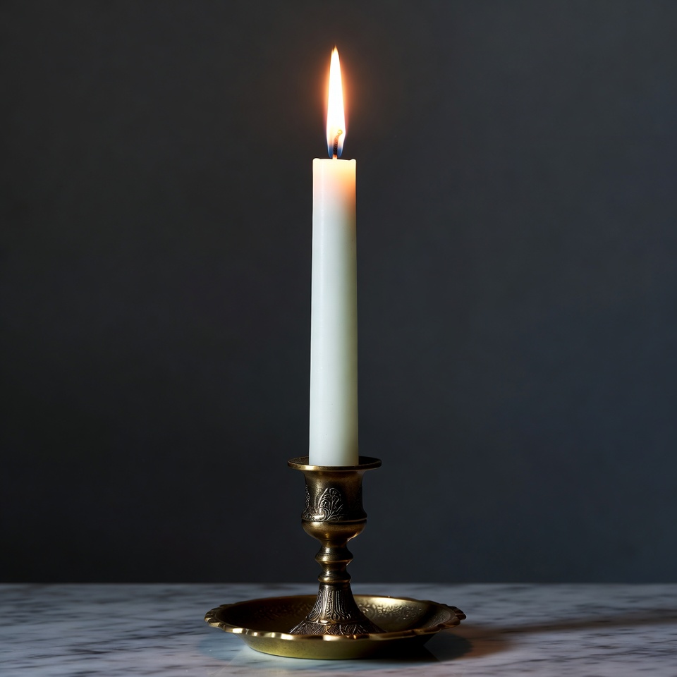 A tall white candle with a bright flame sits in an ornate brass candlestick. The candle is centered on a dark surface with a subtle gradient background. The brass base features intricate detailing and a saucer dish.