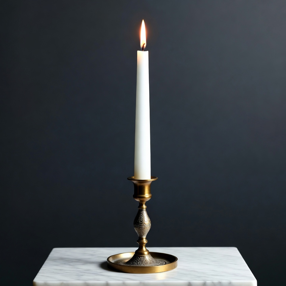 A tall white candle with a bright flame sits in an ornate brass candlestick on a white marble surface. The candlestick features intricate engravings and a round base. The background is solid dark gray.