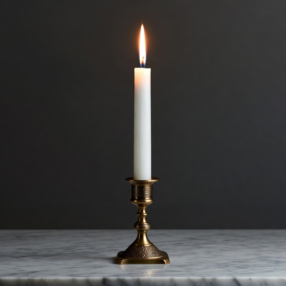 brass candlestick, burning candle, candle flame, candlestick, dark background, decorative, elegant, fire, flame, holiday candle, isolated, lit candle, marble surface, romantic lighting, single candle, still life, taper candle, votive, warm light, wax candle, white candle, wick, candle