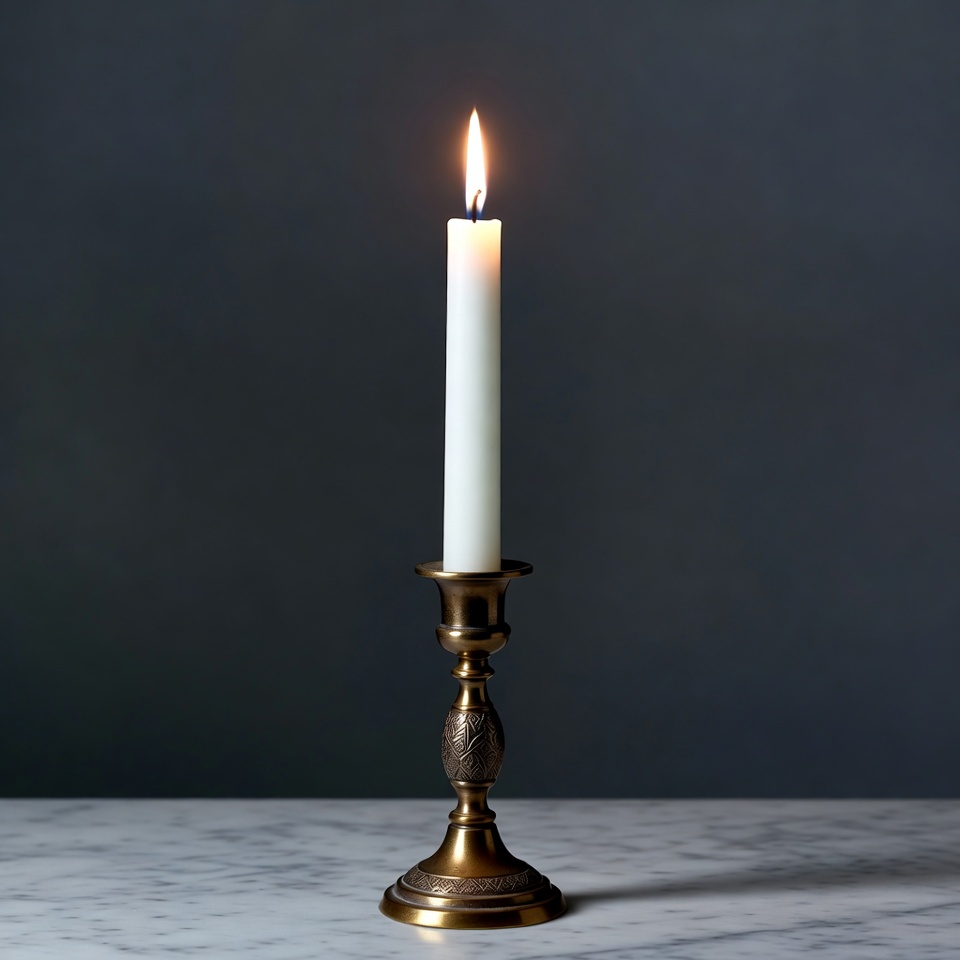 Lit White Candle on Brass Candlestick