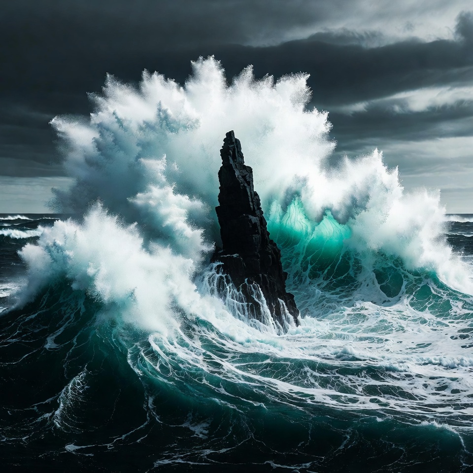 Towering white waves crash dramatically against a tall, jagged black sea stack rising from the turbulent ocean. Dark storm clouds fill the sky, adding intensity to the scene. Foamy green-tinged water surges around the rock formation.
