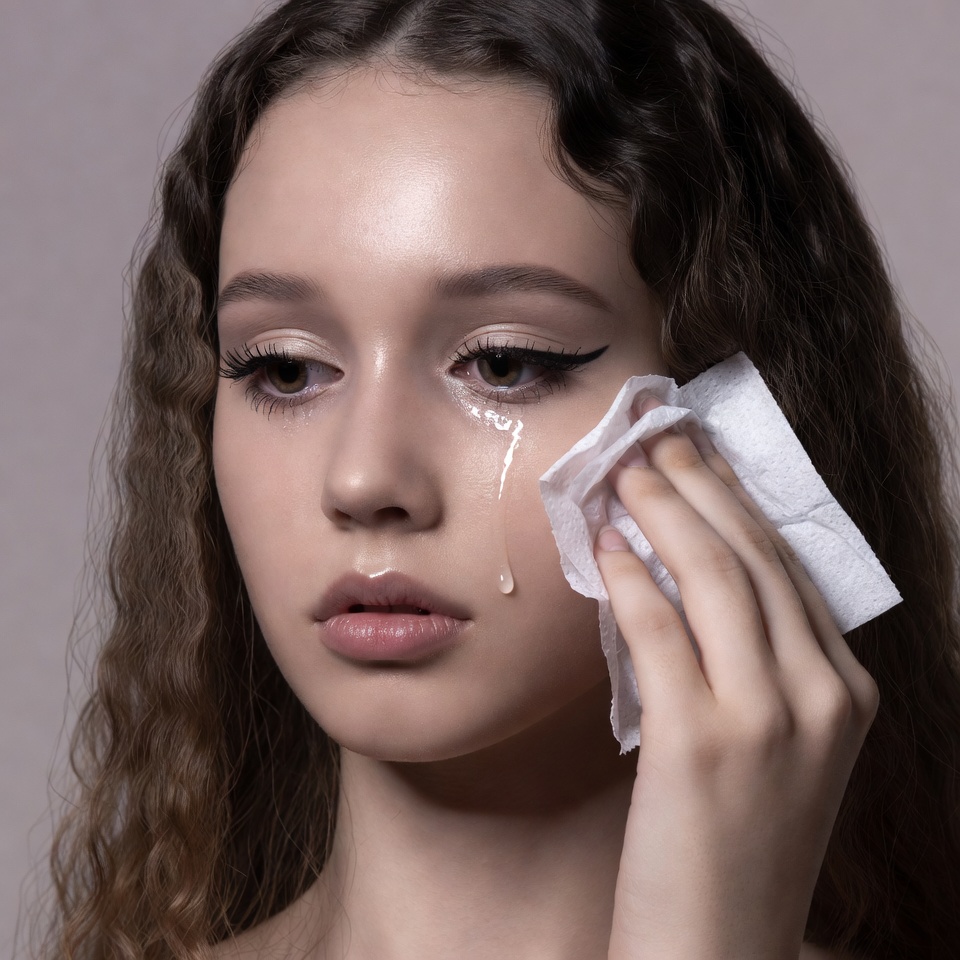 A young woman with wavy dark hair holds a white tissue to her face, wiping away tears streaming from her eyes. She has glossy lips and winged eyeliner, gazing slightly downward. Her skin is smooth and the background is plain gray.