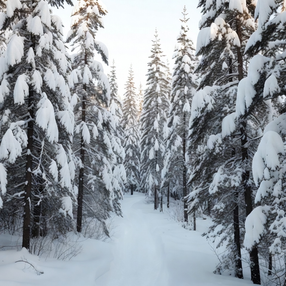 A narrow snow-covered path winds through a dense forest of tall pine trees blanketed in heavy white snow. The trees stand closely together with branches laden with snow, creating a tunnel-like effect. Soft light filters through the scene, highlighting the pristine winter landscape.