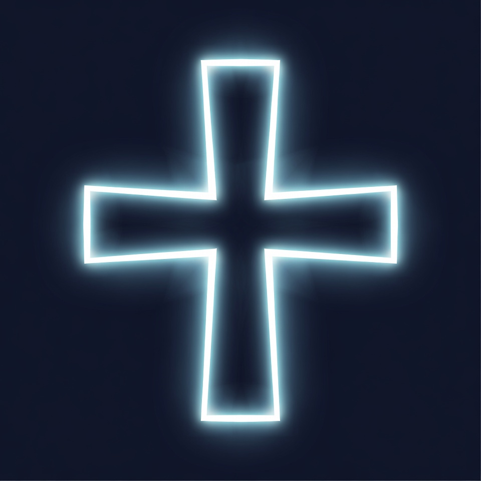 blue background, christian cross, christianity, clipart, faith, glowing cross, illustration, isolated, neon cross, religious symbol, symbol, white neon, cross