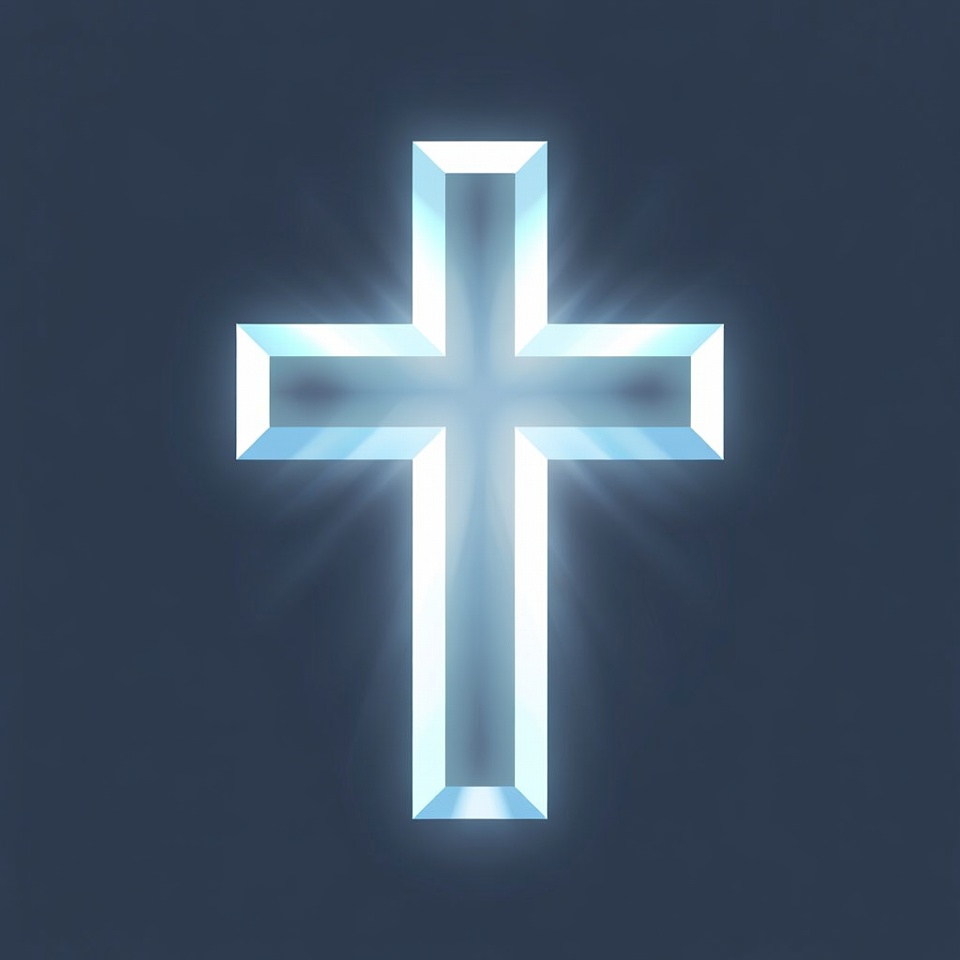 A glowing white Christian cross is centered on a dark blue background. The cross features bright neon edges and a radiant light effect emanating from its center. It appears as a digital illustration with a 3D beveled design.