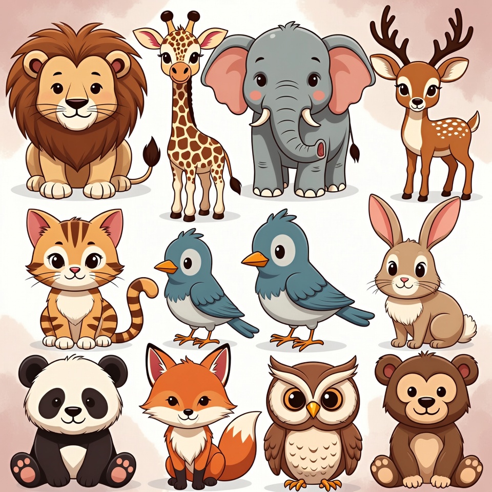 animals, big eyes, birds, bunny, cat, clipart, cute animals, deer, elephant, forest animals, fox, giraffe, illustration, isolated background, kawaii, lion, monkey, owl, panda, rabbit, vector art, wildlife, zoo animals, cartoon animals