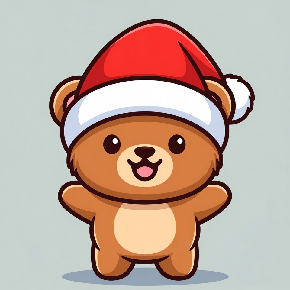 Christmas bear, Santa hat, adorable animal, arms outstretched, big eyes, cartoon bear, chibi bear, clipart, festive bear, gray background, holiday bear, illustration, isolated background, kawaii bear, red hat, smiling bear, teddy bear, vector art, white pom-pom, cute bear