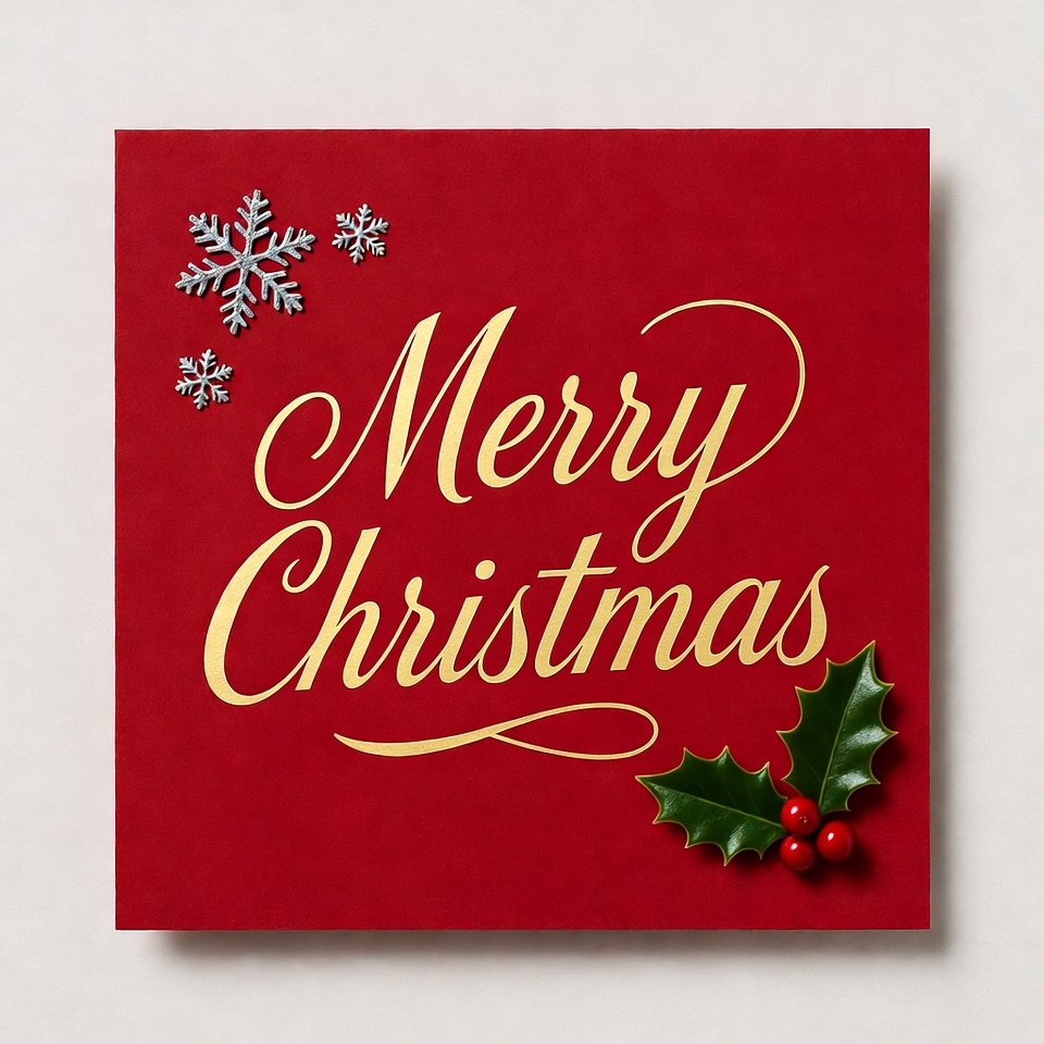 Christmas card, Christmas decoration, Christmas graphic, Christmas greeting, cursive text, festive design, gold lettering, gold text, holiday card, holly, holly leaves, red background, red berries, red card, silver snowflakes, snowflakes, snowy flakes, square card, winter holiday, Merry Christmas