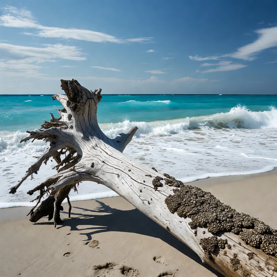 barnacles, beach, bleached wood, blue sky, clouds, coast, driftwood log, footprints, nature, ocean, sand, sea, seascape, shoreline, sunny day, tropical beach, turquoise water, waves, white wood, driftwood
