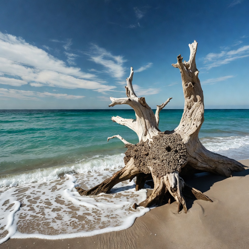 A large bleached driftwood log with twisted branches sits on a sandy beach. Gentle waves lap at its base under a clear blue sky with scattered clouds. Turquoise ocean water stretches to the horizon behind it.