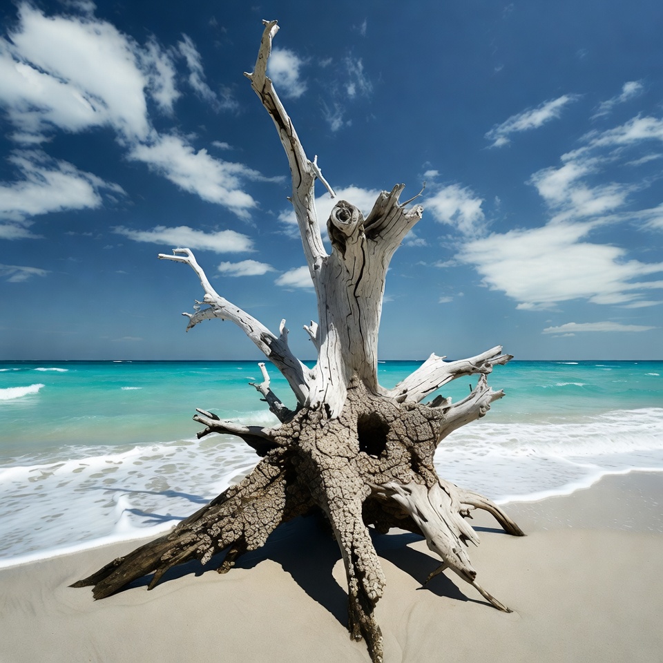 A large bleached driftwood trunk stands prominently on a sandy beach with turquoise ocean waves lapping at the shore. The wood features twisted branches reaching into a bright blue sky dotted with white clouds. The scene captures the natural beauty of the tropical coastline.