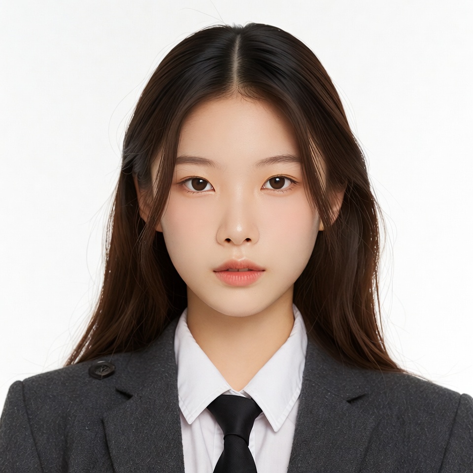 Asian, black hair, black tie, female, formal attire, grey blazer, headshot, isolated background, long hair, portrait, school uniform, student, white shirt, young woman, woman