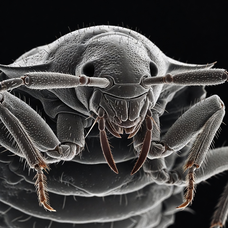 antennae, arthropod, black background, close-up, crustacean, detailed, gray exoskeleton, hairs, insect-like, isopod, legs, macro photography, pillbug, roly-poly, segmented body, texture, woodlouse