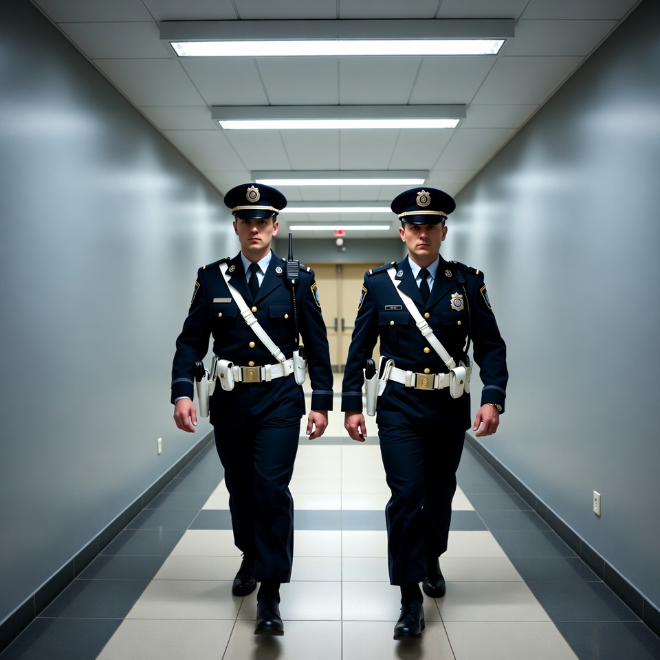 Two male police officers in dark blue uniforms with white belts and hats walk side by side down a long indoor corridor. The hallway features fluorescent ceiling lights, tiled floors, and gray walls with doors on both sides. They stride purposefully toward the camera.