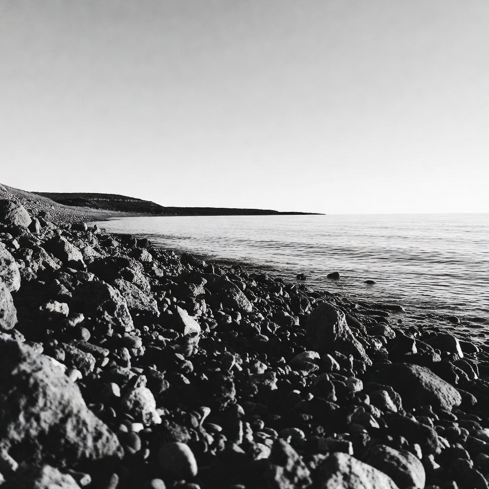 A black and white photograph captures a pebbly rocky beach meeting calm ocean waters. Gentle waves lap against the dark stones in the foreground, with a distant grassy cliff lining the horizon. The expansive sea stretches under a clear sky.