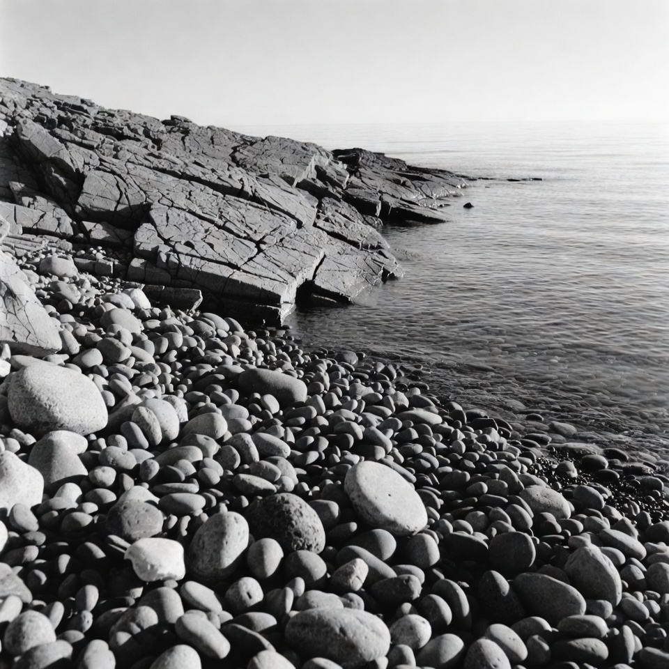 A black and white photograph captures a rugged rocky coastline meeting calm ocean waters. Large jagged rocks line the edge, covered with smooth pebbles and stones scattered across the shore. The scene extends to the horizon under a clear sky.