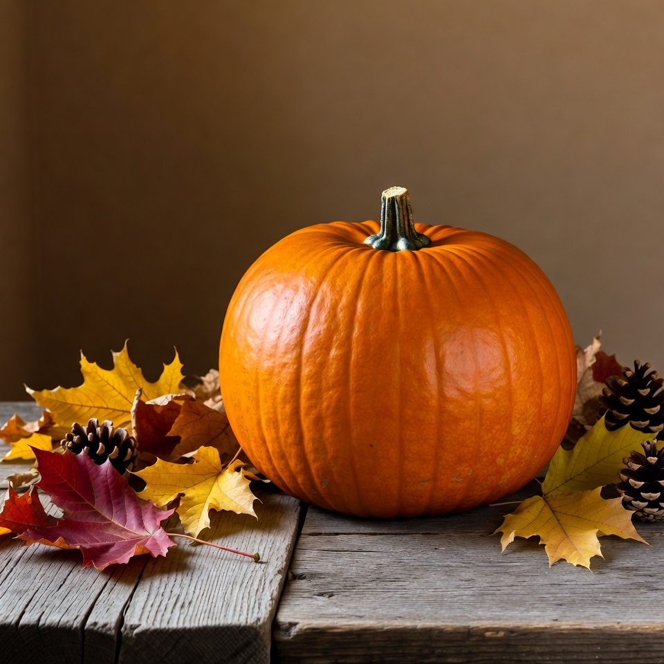 A large orange pumpkin sits on a rustic wooden surface surrounded by colorful fall leaves in shades of red, yellow, and orange. Pinecones are scattered among the leaves, enhancing the autumn theme. The background is softly blurred in warm tones.
