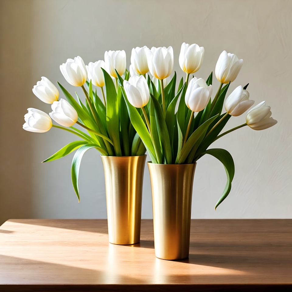 White Tulips in Gold Vases