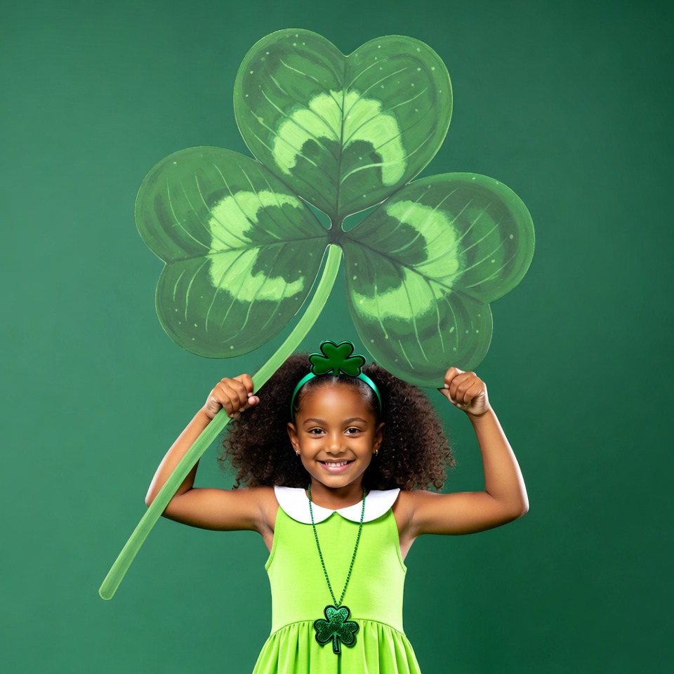 A young Black girl with curly hair smiles while holding up a large four-leaf clover shamrock above her head. She wears a green dress with a shamrock necklace and a green headband. The image features a vibrant green background.