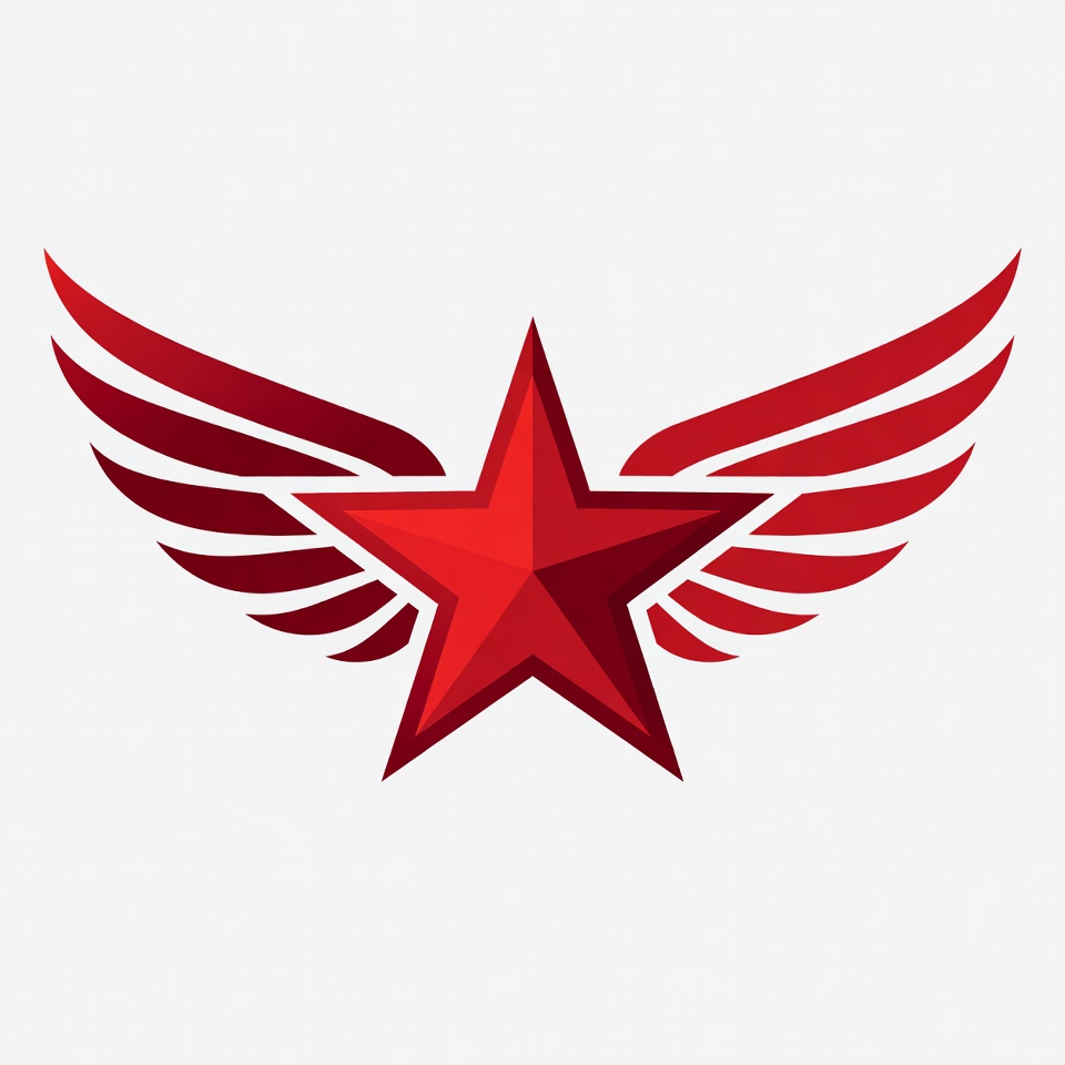 3D star, bold red, clipart, emblem, five-pointed star, gradient star, graphic design, illustration, isolated background, logo icon, red wings, shiny star, star wings, symbol, vector graphic, white background, winged star, red star
