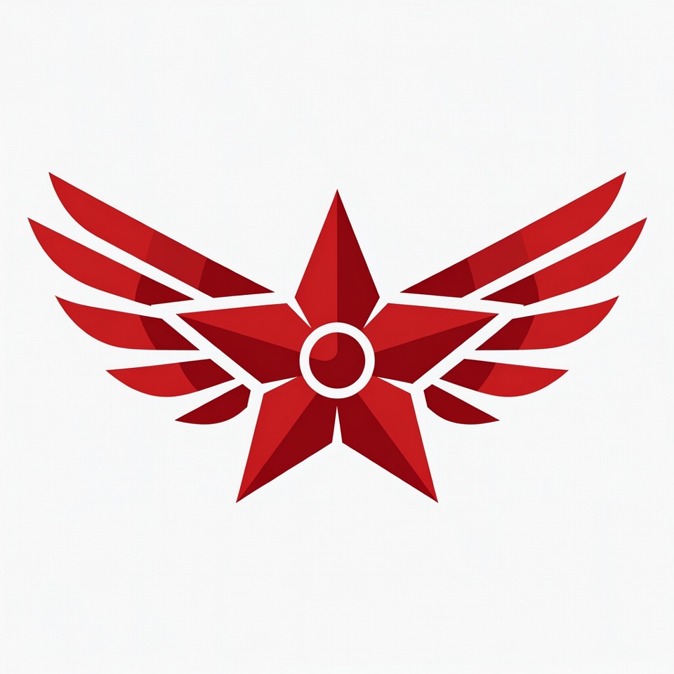 bold red, clipart, five-pointed star, flat design, graphic design, illustration, isolated background, logo design, red wings, star emblem, star wings, symbol, vector graphic, winged star, red star