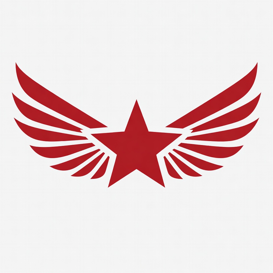 A bold red five-pointed star centered with large outstretched wings on both sides. The design features clean lines and a flat vector style. It is isolated on a white background.