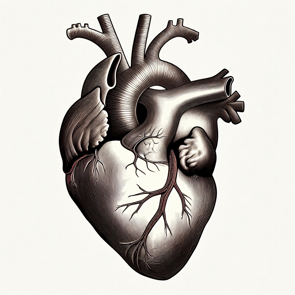 A detailed line art illustration of a human heart with visible ventricles, atria, and major blood vessels. The artwork features intricate shading and textures on a white isolated background. It showcases the anatomical structure in a realistic style.