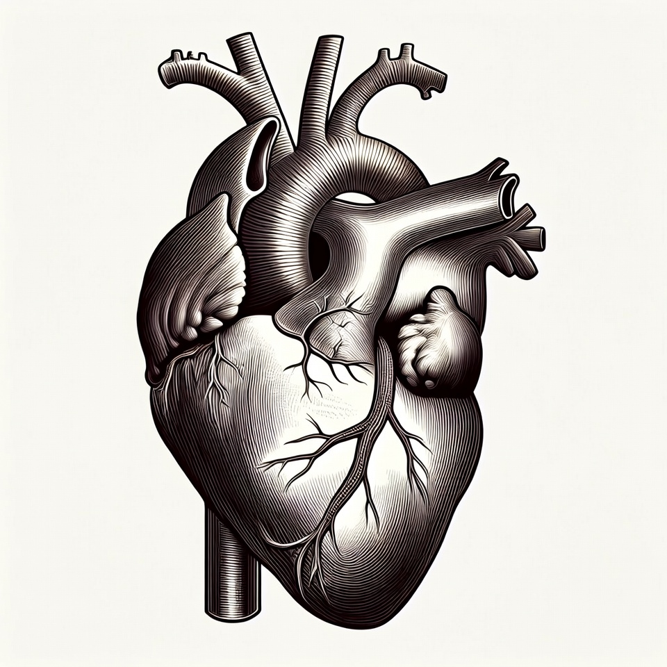A highly detailed black and white illustration of a human heart is shown on a plain background. The heart features prominent ventricles, atria, aorta, and pulmonary arteries with intricate shading and textures. Veins and muscle fibers are realistically depicted in a realistic anatomical style.