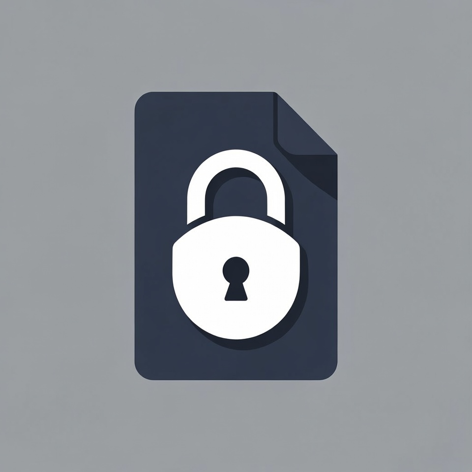 A flat design icon depicts a dark blue document with a white padlock centered on it. The document has a curled upper corner and is set against a light gray background. The padlock features a keyhole and clean, simple lines.