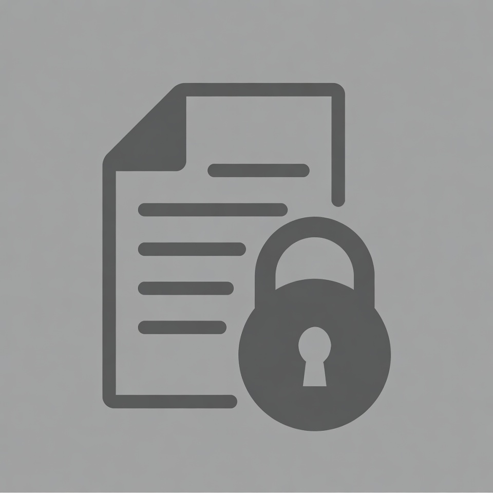 A simple line art icon depicts a document with a large padlock positioned over it. The document features a flipped top page and horizontal text lines. Both elements are rendered in gray outlines on a light gray background.