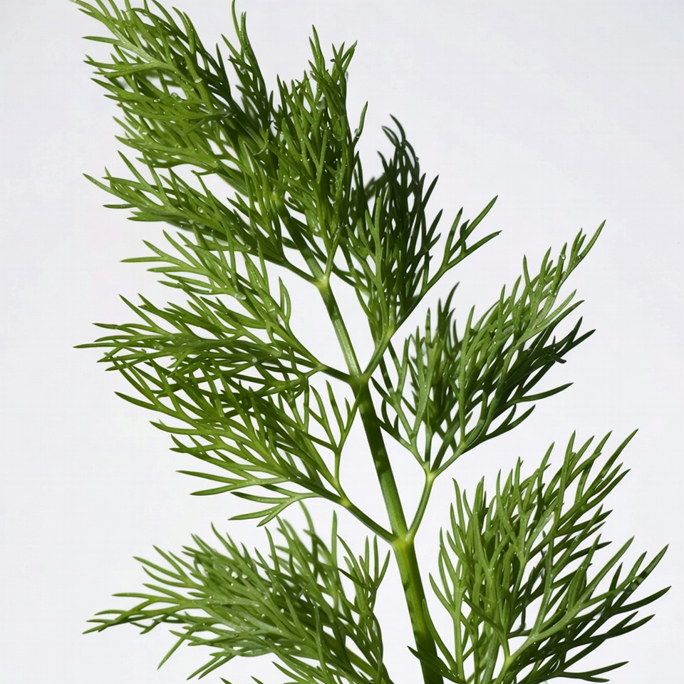 A vibrant green dill plant with feathery leaves is isolated against a plain white background. The herb features numerous thin, delicate fronds branching from a central stem. It is photographed from a close-up angle to highlight its fresh texture and fine details.