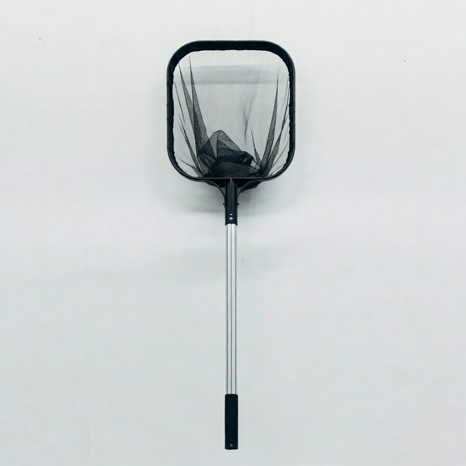 black frame, cleaning net, debris net, isolated background, leaf net, mesh net, pool maintenance, pool net, pool tool, silver handle, skimmer net, swimming pool, telescopic pole, water skimmer, pool skimmer