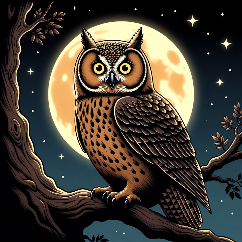 A detailed illustration of a large owl with yellow eyes perched on a tree branch. A bright full moon glows behind it against a starry night sky. The owl's feathers are intricately textured in brown and orange tones.