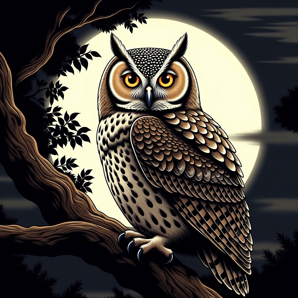 A detailed illustration of a large owl with orange eyes and spotted feathers perches on a tree branch at night. A bright full moon glows behind it, surrounded by dark branches and a starry sky. The owl faces forward with talons gripping the branch.