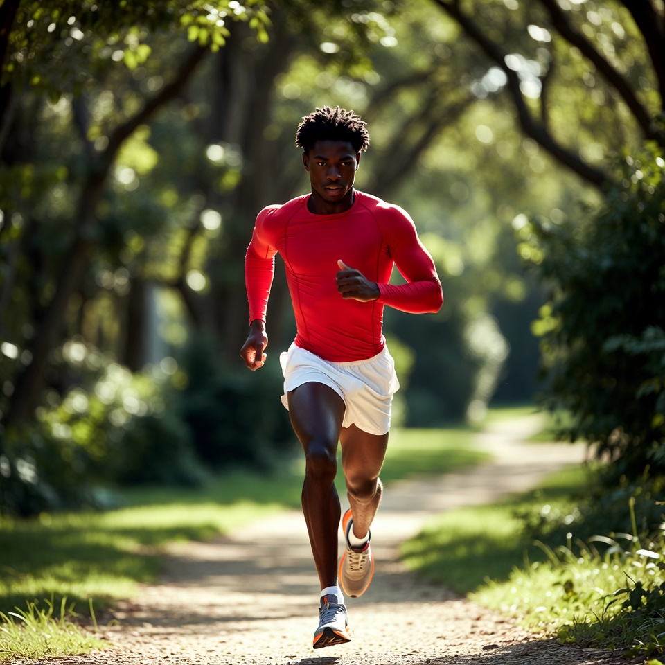 A muscular African-American man runs on a tree-lined dirt trail in a lush green park. He wears a red long-sleeve athletic shirt, white shorts, and gray running shoes. Sunlight filters through the overhead canopy, illuminating his focused stride.